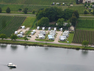 ...att åka vidare. Det smärtar lite måste vi inrymma - här i Minheim kan man stanna åtskilliga veckor utan problem. Det finns så mycket att göra i omgivningarna, som t.ex. att cykla till alla andra vinbyar som ligger på bara några kilometers avstånd. Ta gärna en tur förbi Piesport och bort till Neumagen Dhron t.ex. och ät lunch på Restaurant Käptn Cook som ligger 100 meter från Mosel och intill Marinan för fritidsbåtar med adress Moselstrasse 21. Där finns det också en ställplats - men den är inget att skriva hem om ! Eller ta en promenad ovanför Minheim - då får du den här utsikten på köpet. Här ser du ställplatsen i grannbyn Piesport. Också trevlig, men inte lika fin som den i Minheim !